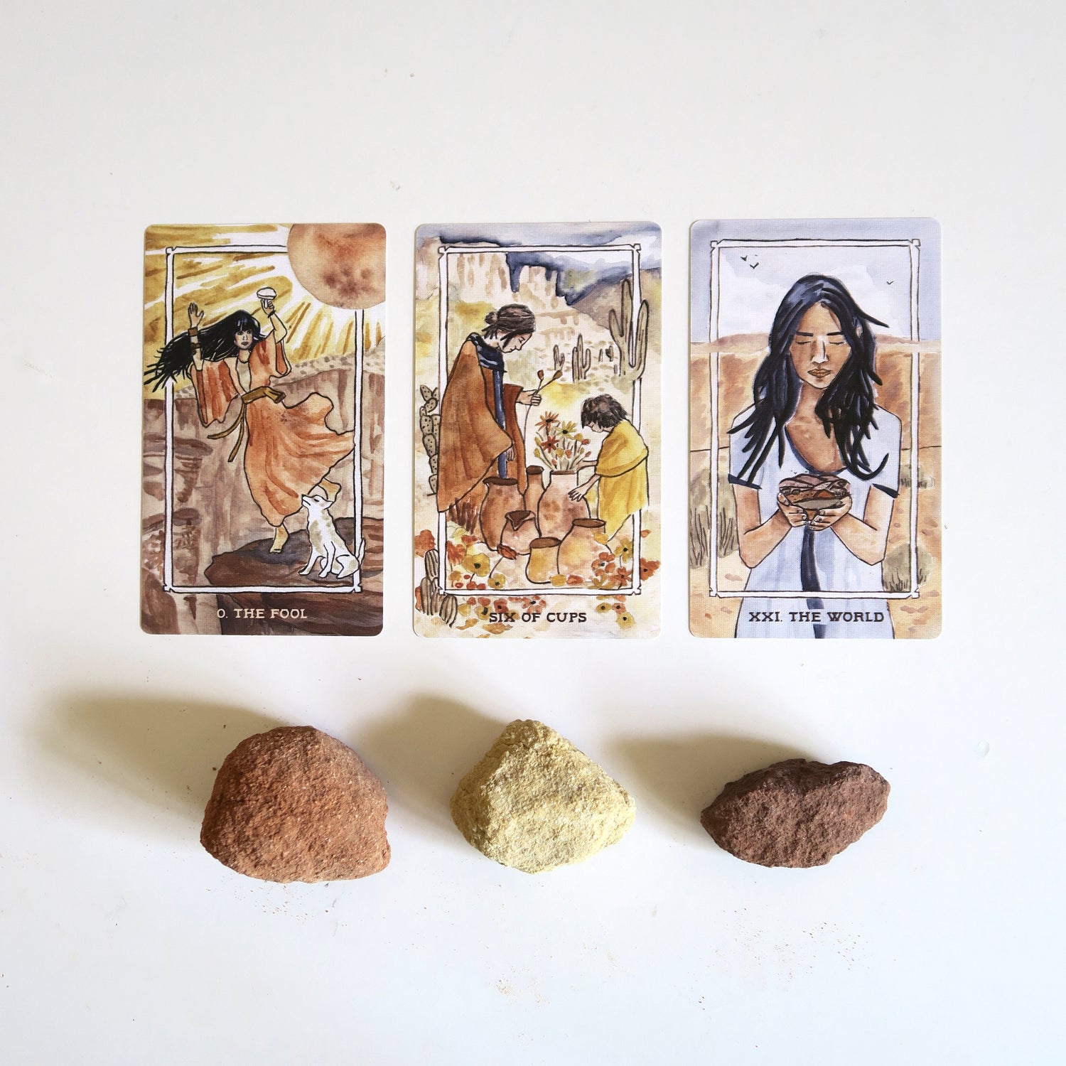 This 78-card tarot deck is hand-painted using watercolors made from rocks and organic materials that I foraged across New Mexico. Each pigment was ground by hand using a mortar and pestle and bound with natural ingredients to create a paint that carries the texture, spirit, and energy of the land itself. Every card is an original painting, rooted in the archetypes of human experience and inspired by the rhythms of the desert, the mountains, and the cycles of nature.